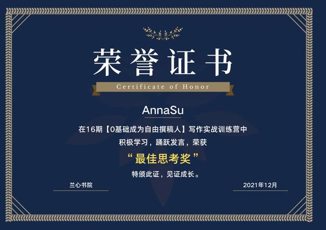 作为职场老鸟的安娜姐姐,起初我只是爱好阅读,从来不曾想过自己会做自媒体运营,毫不夸张地说,没有兰心我没有今天的自信去发布作品,如今的我已经找到了深耕方向,当然会不断探索,不断学习,不断沉淀,每一天都有进步,期待更好的自己!