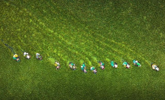 菱角是中秋时节最为传统的时令食物之一。近日,菱角采收迎来高峰期。图为8月13日,泰州市姜堰区淤溪镇卞庄村,村民们正划着菱桶采收菱角。