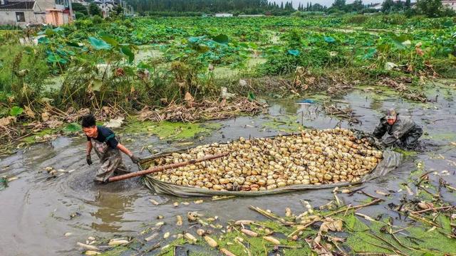 9月3日,泰州市靖江马桥镇集福村,莲藕种植户抓紧时间在水田中采挖莲藕,他们用彩条布将挖出的莲藕兜上,一人在前拽,一人在后推,小山似的莲藕好似载满货物的小船行驶在水面上。