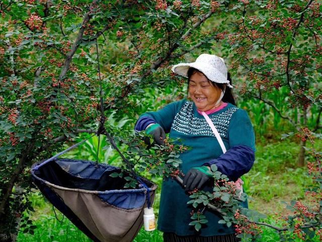 8月10日,山西省长治市平顺县罘兰岩村的花椒进入采摘季。50岁的村民桑喜英熟练地采摘花椒。桑喜英说,她的100多株花椒树可收获200余公斤花椒,收入1万元。