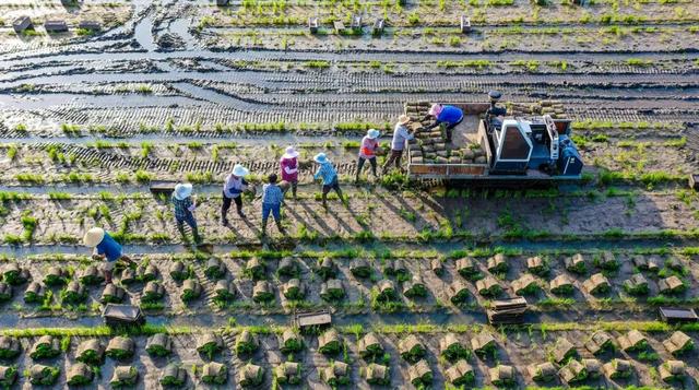 6月18日晨,旭日初升,阳光洒在姜堰区梁徐镇祥茂家庭种植农场秧池上,秧池里,村民们正忙着起运秧苗。