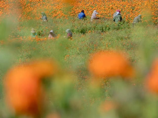 9月1日,黑龙江省牡丹江市东安区兴隆镇东村。近日,万寿菊开始大面积丰收。为了尽快出口,农妇们正在辛勤釆摘。金色的花海成为一道亮丽的风景线,也为当地居民带来可观收入。