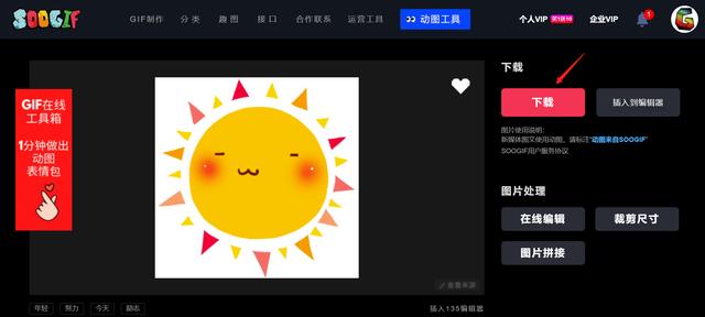 一个动图平台,资源非常丰富,只要输入关键词搜索,找到想要的动图,单击进入下载界面即可。除了搜索之外,还可以自己制作动图。