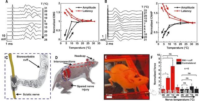 冷却植入物与大鼠坐骨神经接触。植入物柔软的机构没有引起机械性损伤。将神经从37℃冷却至10摄氏度时,机械敏感性阈值增加七倍,与冷却诱导的显著的镇痛作用一致。