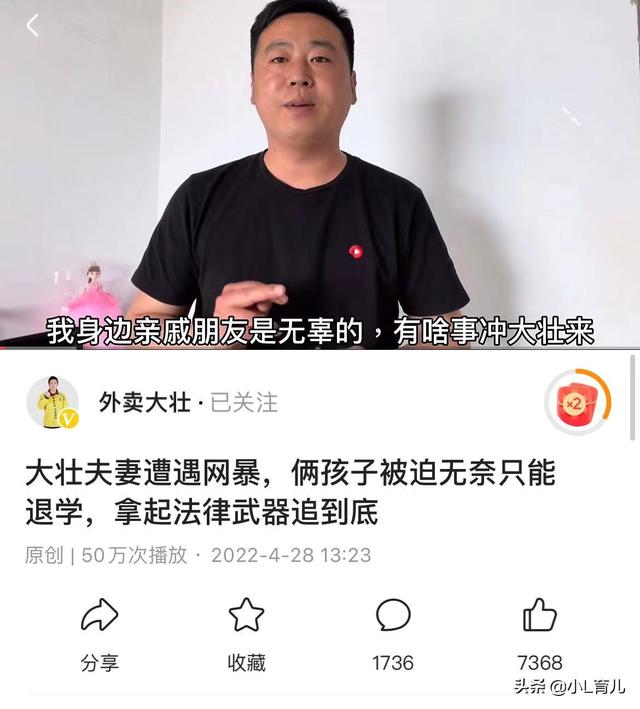 外卖大壮是一个拥有39万粉丝,自媒体收入自爆月入过万的大V。也是我一直关注的一个自媒体网红。大壮本身是一个北漂的美团外卖小哥,每天努力地送外卖挣钱,妻子小陈没有固定收入平时兼职外卖,拍视频照看两个龙凤胎。这样一个并不富裕的家庭,自媒体的收入是绝对不可舍去的,第一次遭遇网络暴力是大概21年年底导致孩子在北京被迫退学,大壮夫妻带孩子回了老家。