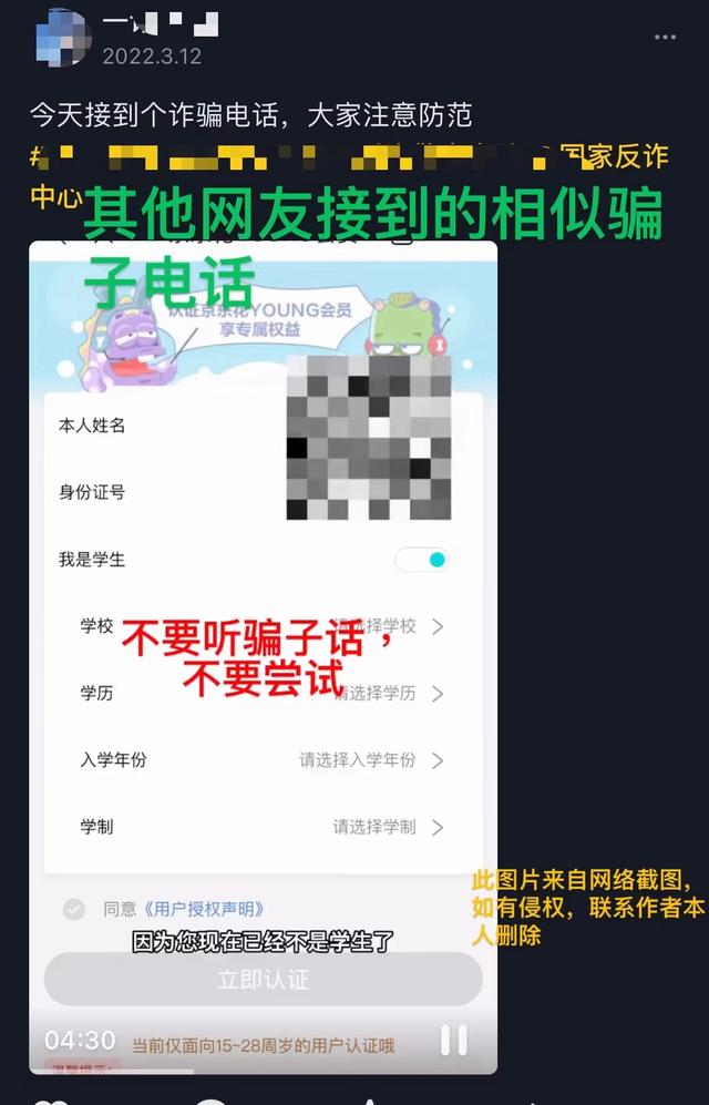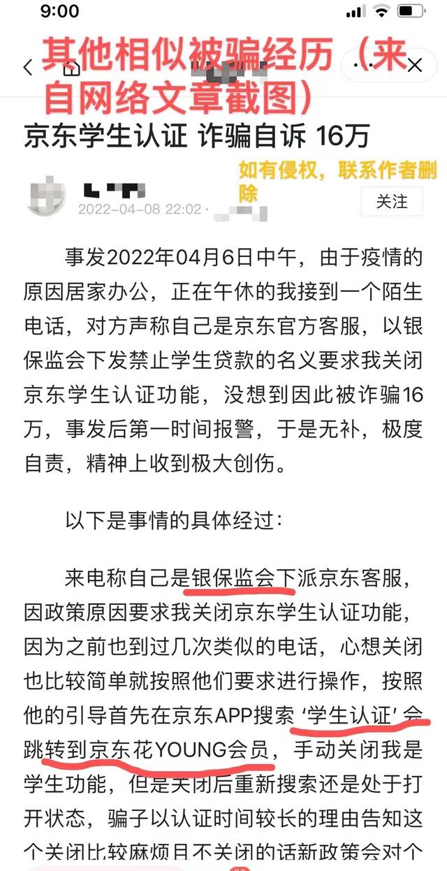(这么一想我有些后悔,为什么没有主动直接联系京东官方平台的客服?主动验证一下有没有关于取消学生认证操作的这么一件事情,如果当时脑子稍微转个弯儿就不会受骗了)现在回想起来就是在你接起对方的来电与她产生对话开始就已经被迫洗脑了,容易跟着对方的思路思考问题。最好的办法就是坚决不要接听陌生电话就好!不要给骗子洗脑的机会。