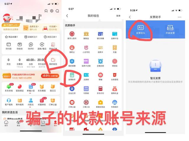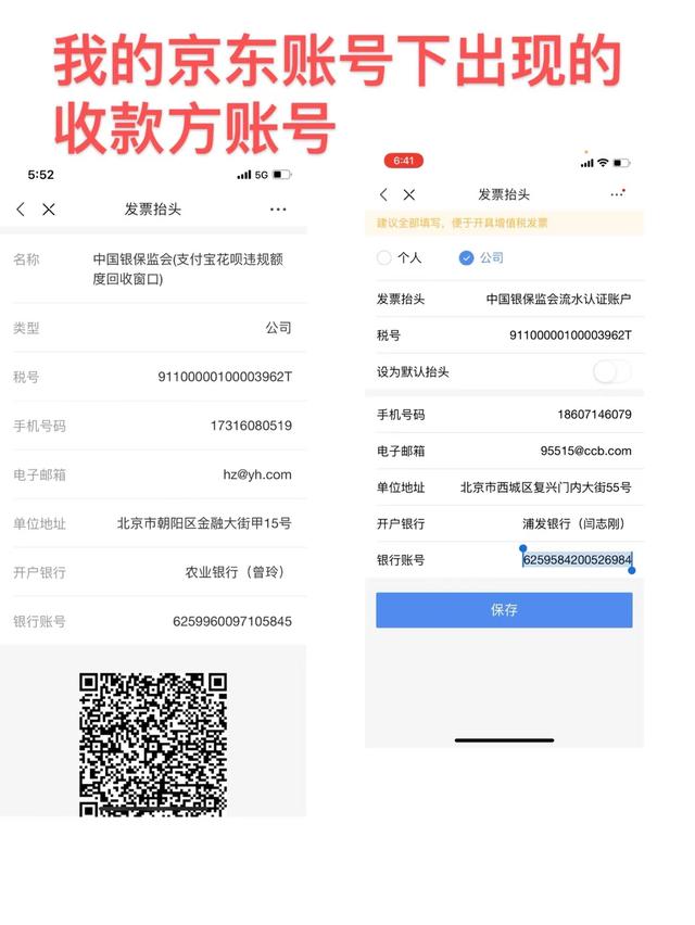 第五步对方让我自己登录我的京东账号,在“我的钱包”,“发票”那一栏,有没有看到一个“中国银保监会的账户”开始让我给对方转账(被骗以后反思,对方从没有提到转账,用的都是“取消额度,回收额度”;让我放松警惕;)我当时以为那个发票栏的信息是京东系统自动生成的,并不是对方直接提供给我的,再加上之前“融易借”我从来没用过,没认为这是我本人的真实借款;当时就脑子进水了一般,理性的思考只是浮于表层,根本就不会深入思考了。对方紧锣密鼓的对话让你根本没有深入思考的机会。