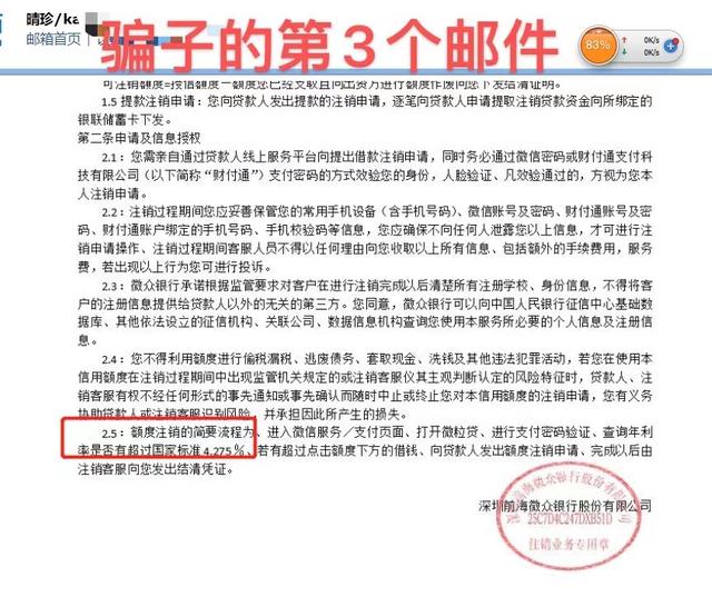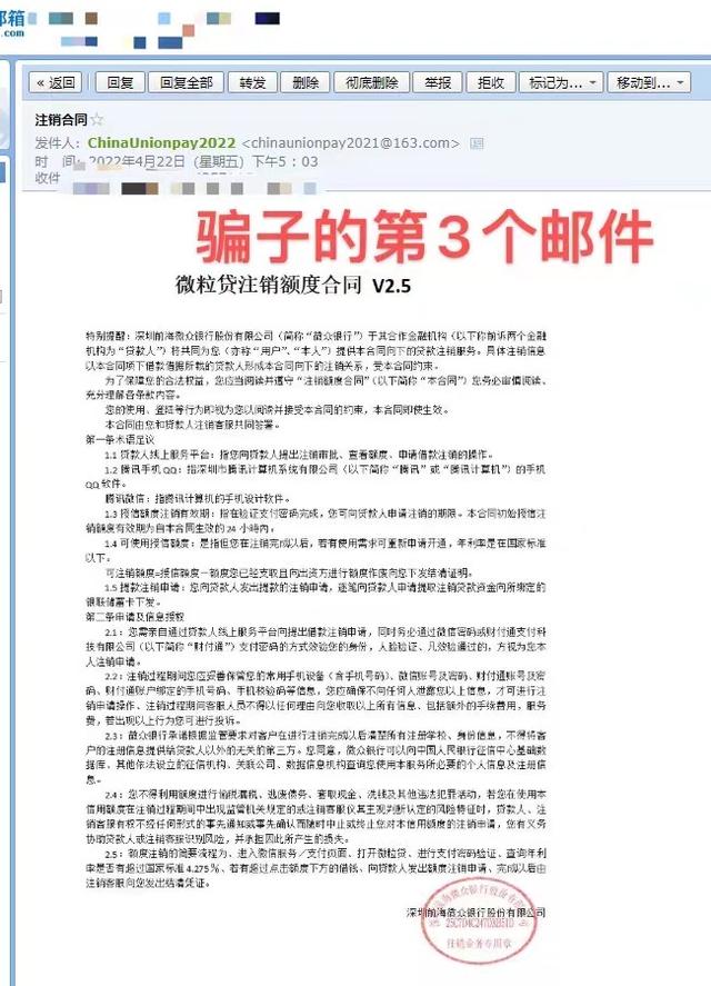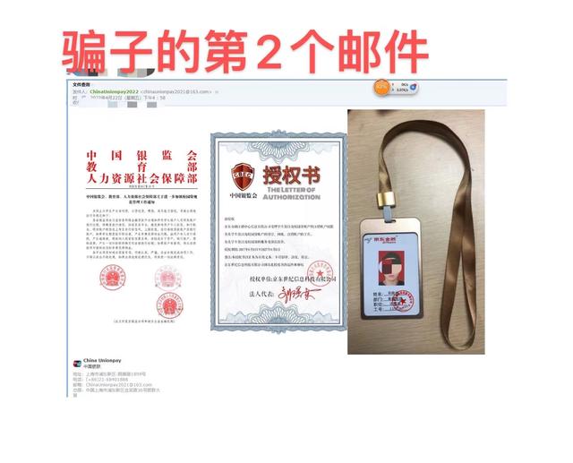 正是由于这个通道被阻断,所以对方才非常急切地要我的邮箱,目的是让我和他之间建立进一步的信任(1是提供给我一份我自己的详细信息,和待处理的事项;2是提供给我他包装出来的合法证件,一个中国教育部、人力资源部、中国银保监会三个部门联合下发的红头文件;一封京东金融被授权的委托书;一个京东金融客服本人的工作证件;3,一封微粒贷注销合同)。注意3封邮件不是同时接收到的,而是根据和他的对话过程,和前后顺序,一个一个接收到的。
