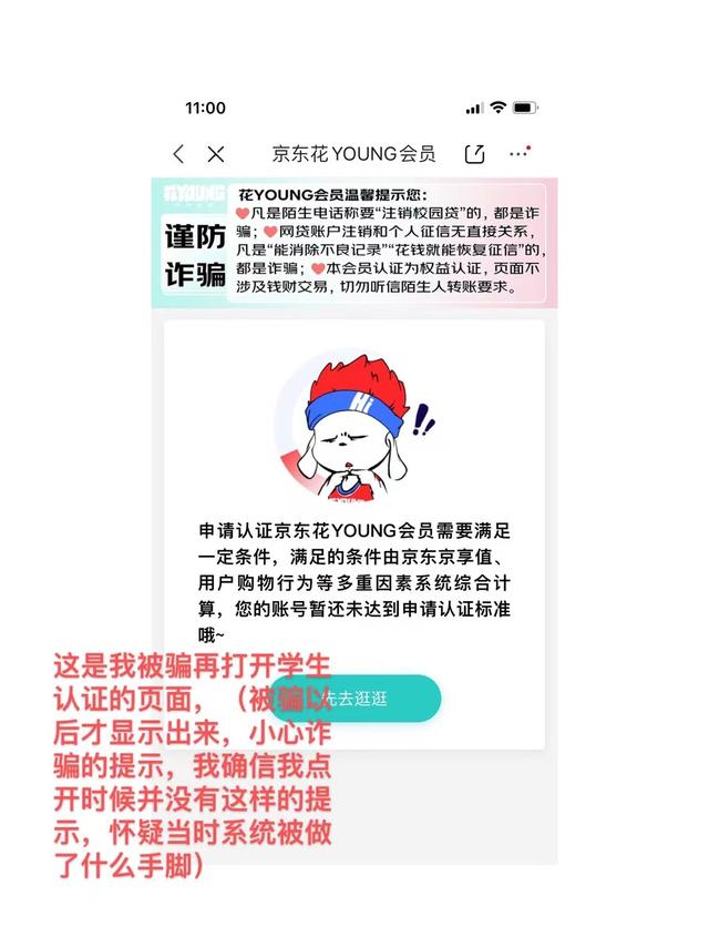 进一步按照指导进入了一个京东花YOUNG会员的蓝色带有卡通形象的页面里面有我是学生,需要取消勾选(将蓝色点为灰色),下边勾选“取消认证”提交。再然后跳转到另外一个界面,有一行蓝色的字体,大概的意思就是“您的年龄已超过学生年龄,不符合什么什么的”(这个页面当时没做保存,被骗以后页面才出现防诈骗提示)。