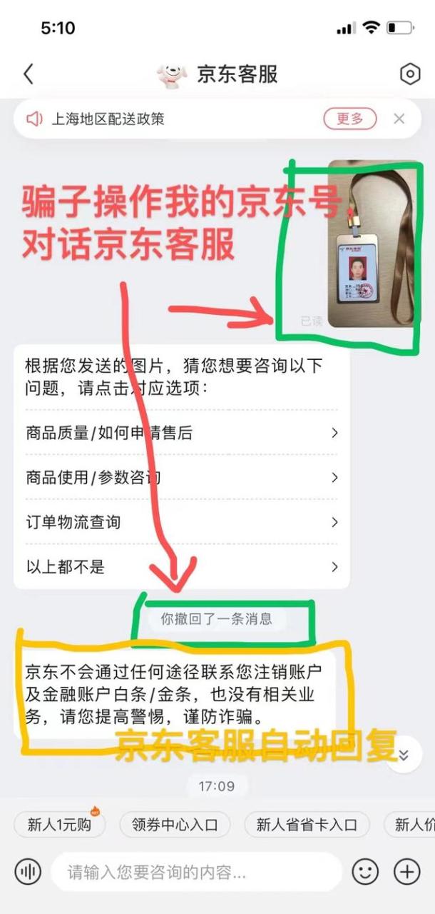 我想过自救,如果在以前,我同时使用两个手机号码,就会用另一个手机号码给我朋友打电话问听说过这样的事情没有,提前解除危机。但是我只有这一个,而我身边,没有别人。又转念一想,即使京东不能全信,加上中国银保监会,加上中国银联?还是选择了相信对方。