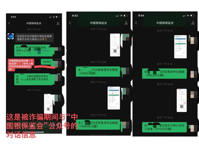 第七步自己已经发生过实际转账了,虽说是相信对方是官方可信任人员,但还是有担忧的,对方又引导我回到“中国银保监会”公众号中,将自己的转账回执单,发送给中国银保监会对话窗口,并发送一条编辑信息“本人***以归还融易借学生额度2万圆整”对方声称他们的这个操作行为在中国银保监会的监督之下进行的,开始让我放宽心;再加上收到的中国银联的第一条验证码,确实不是我本人操作什么系统然后收到的。收款账户也不是对方直接提供,而是京东平台自动生成的(此时我并不知道对方登陆过我的京东账号自己填写的);总之最终结果就还是相信了对方。