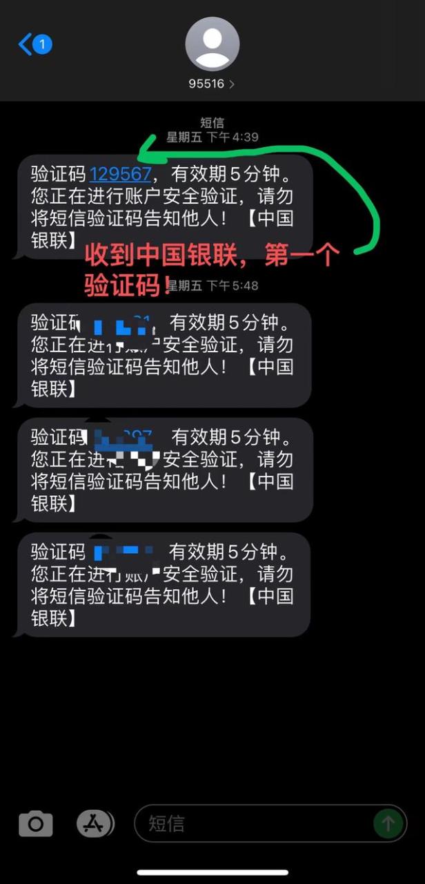 之后我的手机收到了一个中国银联发来的第一个验证码,(被骗以后的反思:到现在我也不清楚这个银联发来的第一个验证码到底是办什么业务?为什么我会收到这个验证码?)也是这个验证码,让我进一步相信对方的身份,相信这是由他来操作银联系统,给我发的验证码。