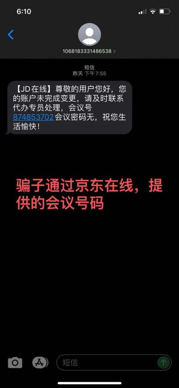 之后收到JD在线的一条短息(内容为:尊敬的用户您好,您的账户未完成变更,请及时联系代办专员处理会议号874853702)祝您生活愉快!