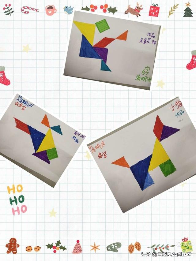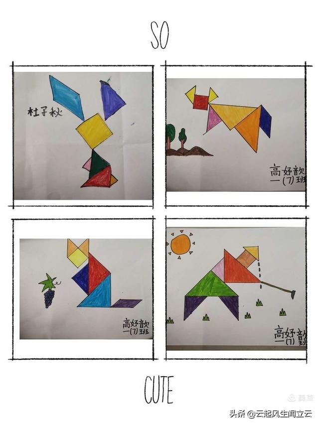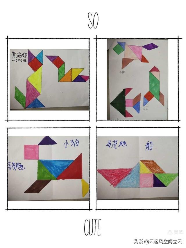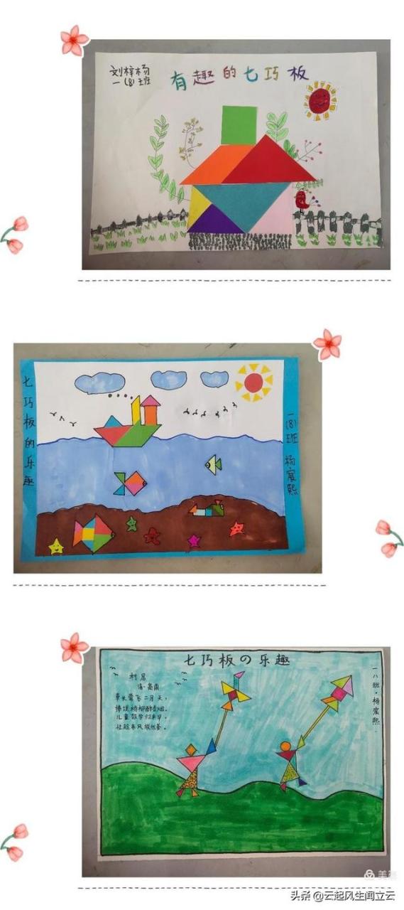 七巧板是我国传统的智力玩具,用它可以拼出千变万化的图形,也称“七巧图”。为了提高孩子们学习数学的兴趣,锻炼孩子们的动手操作能力,一年级数学组开展了七巧板创意拼图活动。