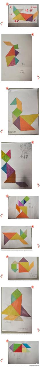 小小的七巧板,几种简单的几何图形,却在这群小小魔术师的手中变成了另外一番模样。他们有的拼成了一只美丽的天鹅,有的拼成了一只可爱的小兔,还有的拼成了一只弯弯的小船……孩子们心灵手巧,个个都是拼七巧板的高手。