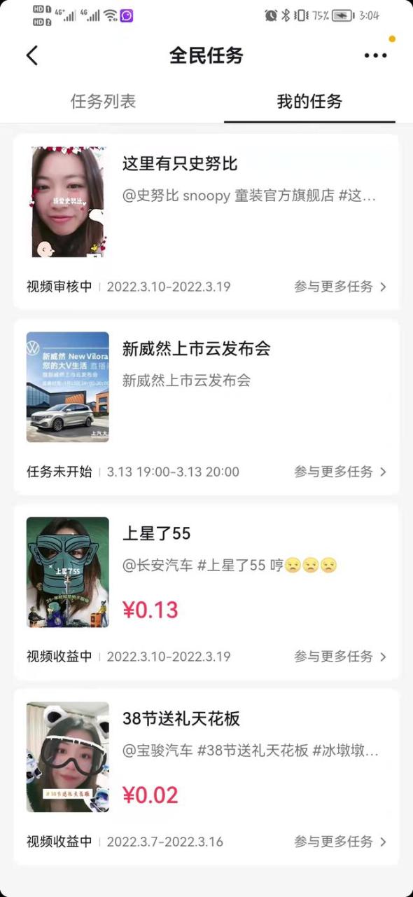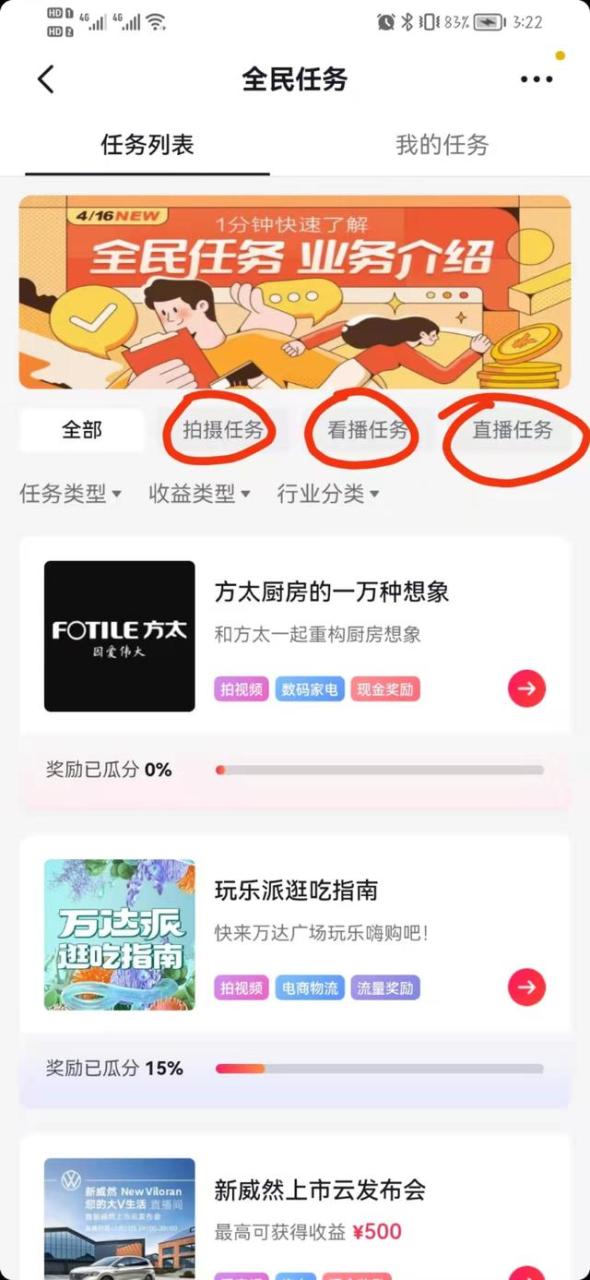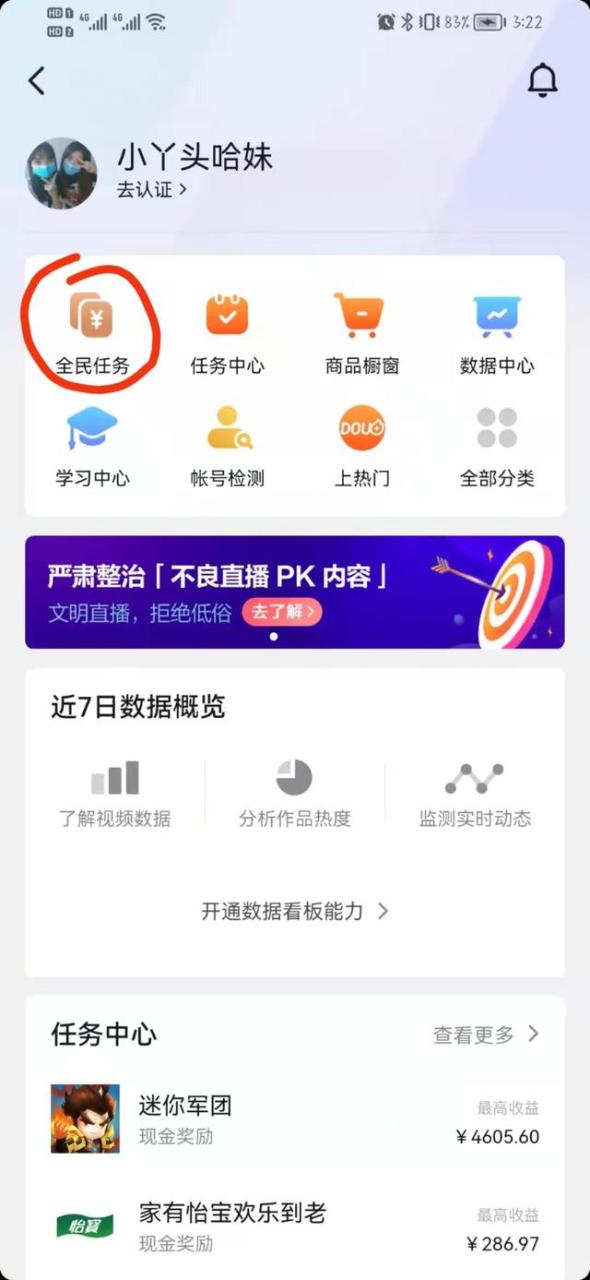 我们打开抖音后点击“我”,找到“创作者服务中心”进去以后再点击“全民任务”,然后我们就会看到里面有有一些任务了,里面有拍摄任务、看播任务、直播任务,你可以选择自己想要做的任务,如果你个人是比较害羞的话可以选择看播任务,还有一些互动任务,我个人是比较害羞的那种,所以我的拍摄视频都不太好,有些放不开。
