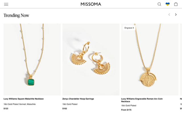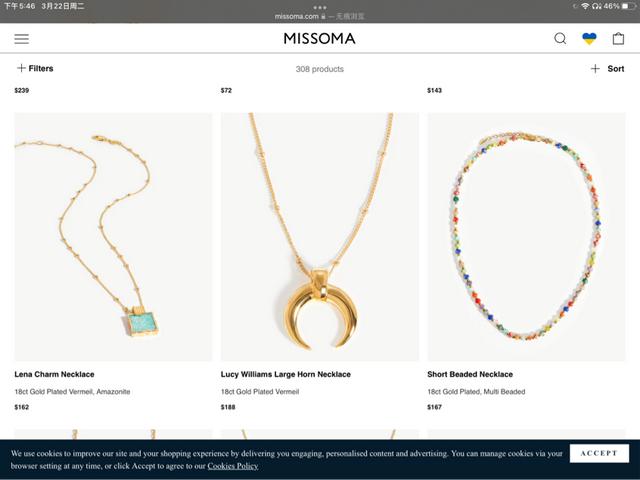 春天脱掉了厚厚的羽绒服,那怎么能少得了小配饰呢,这就来!Missoma家的网站设计是最吸引我的,简约明了,首页大图吸引了我的全部注意,多款项链叠加搭配,真的超cool。Missoma是首批设计中端高级首饰并巧妙运用镀金银材质的品牌之一,采用18K金和纯银打造精致作品。想要搭配漏锁骨的衣服?有!无论是简约的月亮图案,还是七彩的珠子项链,有!都有!而且所有商品在最近一段时间里,都打八折,这哪能不心动啊!虽然它们的网站是英文的,但是丝毫不影响我们,因为图片和价格都写得很明显,而且官网支持全球邮寄,喜欢的姐妹直接下单就行啦!