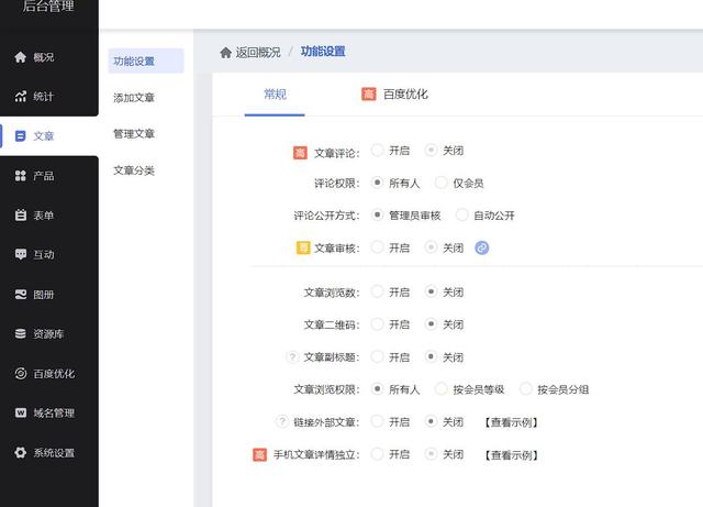 在后端中,通过算法可以自动识别到网站中的文章,在功能设置中,可以对文章添加评论、审核等功能,还可以进行百度优化,实现伪原创判断、关键词AI提取。在文章管理中,可以对文章内容进行管理操作,例如删除、导入、分类等一系列操作。
