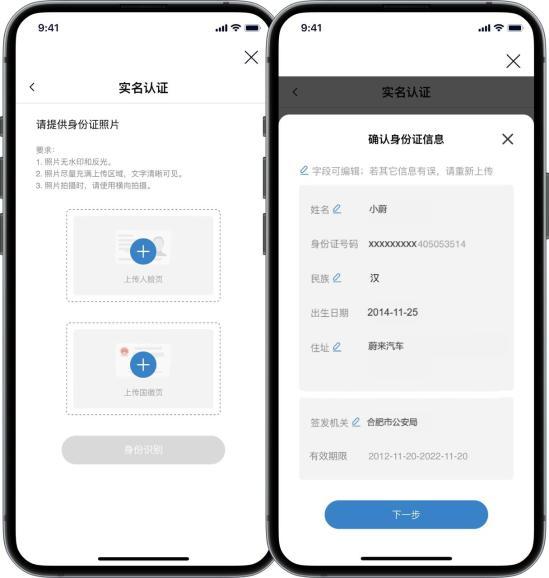 第三步:在此页面中拍摄身份证正反面照片,确保照片清晰无遮挡,不存在阴影、水印或反光等情况。系统将自动识别和填充证件信息,确认无误后可进行下一步。