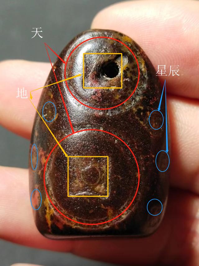 纵目,天眼。再加“瞳仁”的双重眼中眼,理解成洞悉各维度世界也好,理解成横看竖看反复看看透一切事物也罢,总之这代表一只神奇的眼睛。袋子,天眼,谁和这等要素有关系?根据民间传说,似乎只有弥勒佛。据说弥勒心咒(嗡 咪嵟耶梭哈)即有开天眼的特效。弥勒佛在汉地即为持有一大布袋的大腹笑脸形象,其所持布袋即称乾坤袋。那么乾坤袋用来命名此珠合适否?合适!一面是能洞悉万界的天眼,另一面可不是简单的俩铜钱,而是俩天地图腾,针对此珠专业点描述可为“一眼双天地星辰天珠”。据此展开的一幅恢弘画面即为眼中的多重天地宇宙。由此可知,此等乾坤尽括之袋型珠命名为《乾坤袋》再合适不过了!看看下图,远古之人科学吧!哪里有宗教气息呢?!