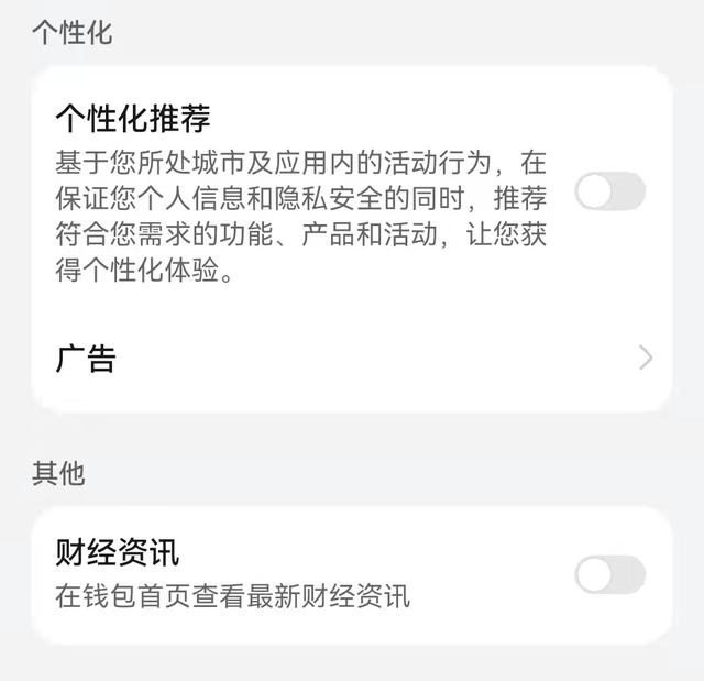 打开华为钱包,打开钱包以后需要我们点击右边的我的,然后有一个其他设置选项,我们点击当然里边会有个性化推荐,我们需要把它关闭,然后的话大家会看到下方会有个资讯,我们需要把它关闭,然后点击广告,广告里边会有一些个性化广告,或者是华为广告三方广告,我们需要都把它关闭,这样的话你的手机基本上彻底关闭了广告。