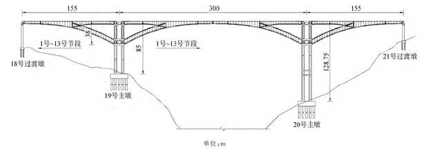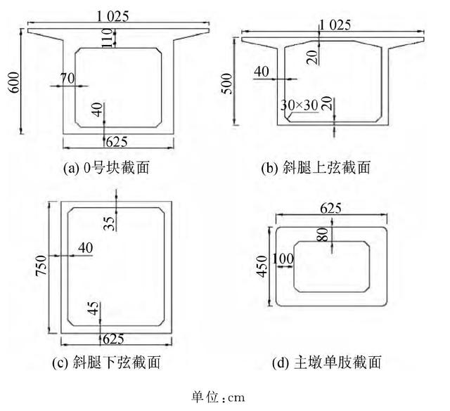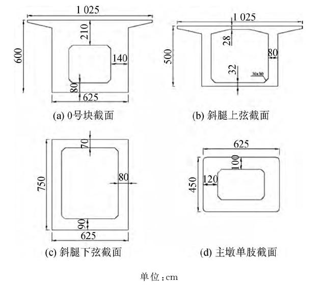 该桥主桥孔跨布置为155 m+300 m+155 m, 立面布置如图2所示。上部构造由0号块、斜腿上弦、斜腿下弦、三角交汇区、悬臂T构和合龙段组成,下部主墩采用双肢空心薄壁墩,典型截面尺寸如图3所示。斜腿根部梁高(斜腿下缘根部至上弦箱梁顶距离)为38 m, 跨中截面梁高为4.5 m, 梁高按2.5次抛物线变化。箱梁采用C55混凝土,主墩采用C45混凝土,预应力钢绞线采用低松弛高强度钢绞线。