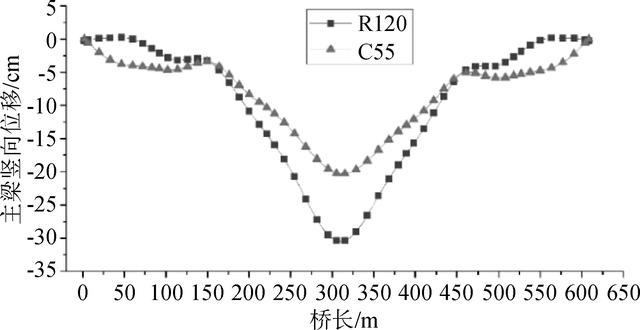 图6为使用阶段两种方案主梁最大竖向挠度对比。可见,空腹式连续刚构桥上部构造采用活性粉末混凝土材料后,箱梁薄壁优化,在减轻结构自重的同时,结构自身的刚度也有所削弱,这导致其跨中挠度值较普通混凝土方案有所增加。