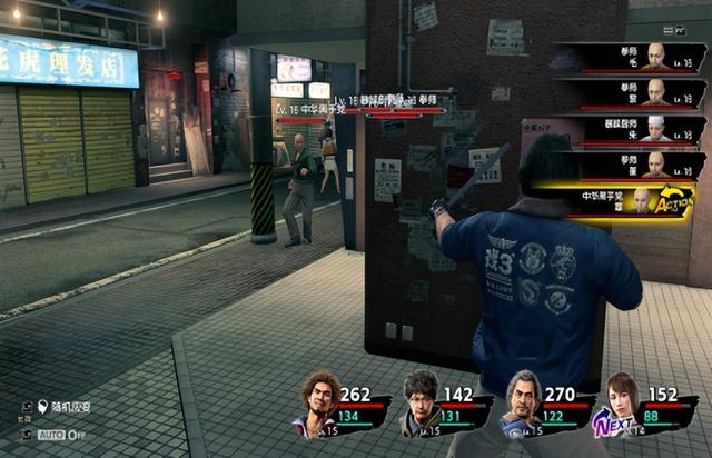 一是增加了环境互动要素。在战斗中,所有的角色会进行【随机走位】,你会看到角色之间互相提防的二人转,或是输出指令后从大老远特地跑来揍敌人一拳的己方角色。随机走位给战斗带来许多未知,AOE的输出也无法知道自己到底能打到多少人,敌人的攻击目标是谁也难以预测。这一机制提升了整个战场的动态感,不再是你一拳我一拳的传统形式,也能很大程度减轻原《如龙》玩家的不适感。这样的随机移动与环境之间具有一定配合,当路径上具有环境要素时,角色也会与其互动。这样一看还是继承了往代的“抡起自行车”战斗的画面。