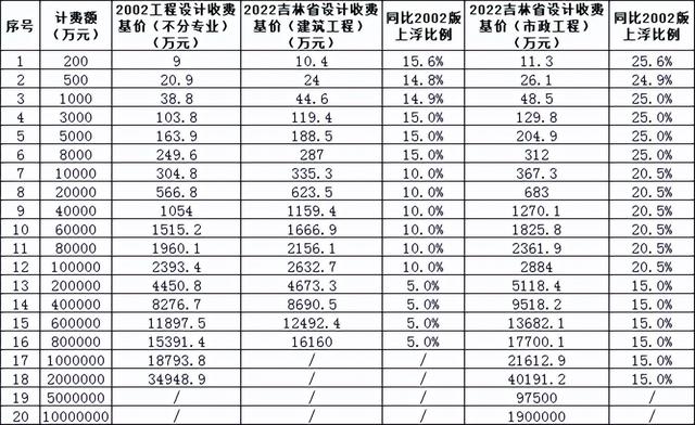 二是规定范围不同,2002版本在收费基价规定上未对专业作细致分类,对建筑市政工程、交通运输工程、水利电力工程、石油化工工程等七个专业在基价上作统一规定;而此版《导则》对工程勘察、建筑工程、全过程工程咨询、市政工程设计收费则根据专业特点分别作不同规定。相比2002版本,建筑工程在200万元计费额档上收费基价上调至10.4万元,同比上浮15.6%,在10000万元计费额档上收费基价上调至335.3万元,同比上浮比率下降至10%,20000万元计费额档上同比上浮比率下降至5%;而市政工程收费基价上浮比率更高,在25.6%到15%不等。